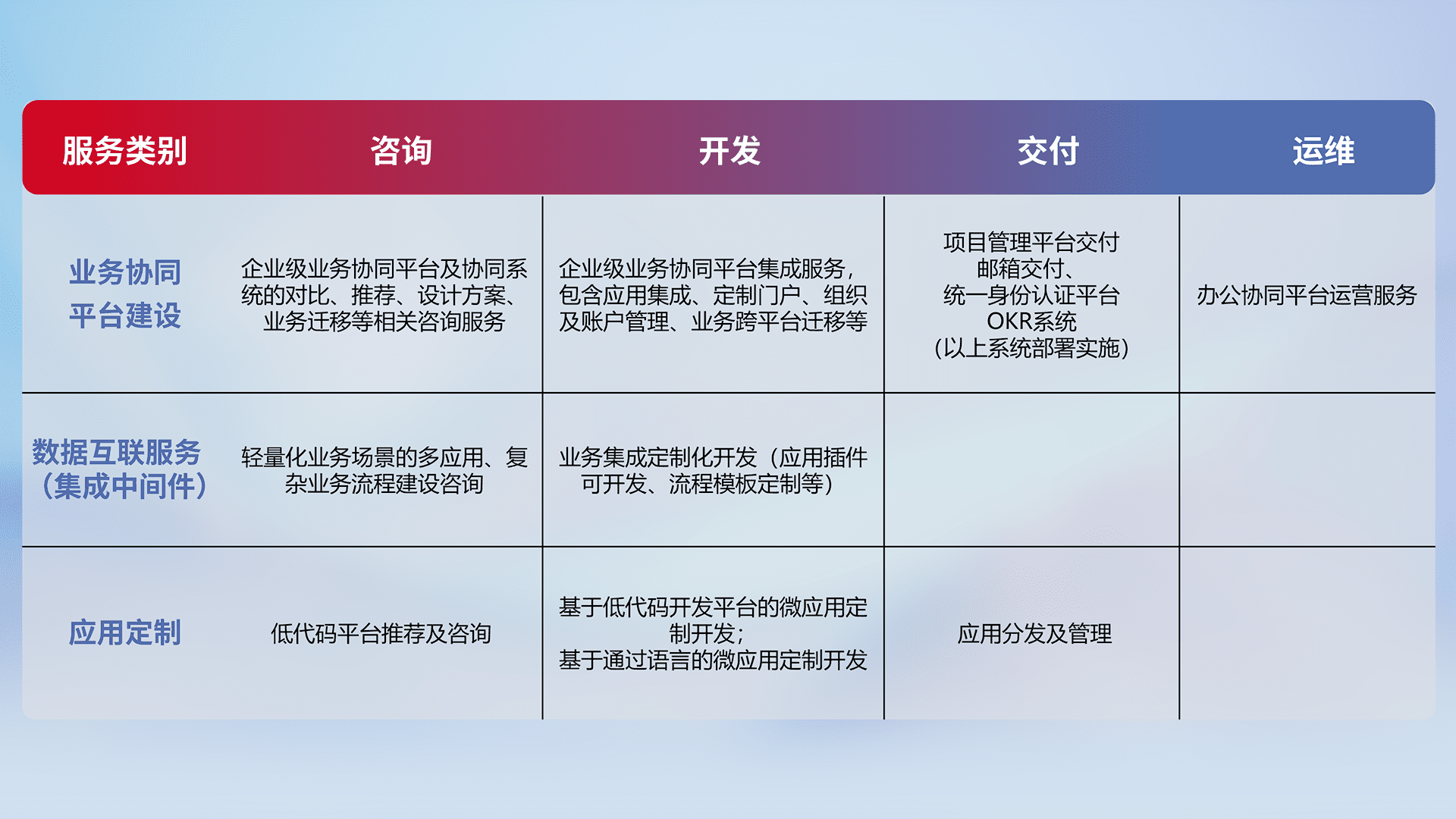针对钉钉、、企微、、、IDaas等平台级产品提供产品的规划、、方案、、交付、、定制化开发等服务,,,实现如统一协同办公、、、、智能客户服务、、混合会议管理、、、智能数据查询、、等业务场景,,,实现数字化转型。。